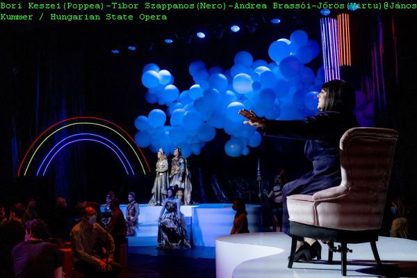 Busenello zeigte die Ereignisse des kaiserlichen Aufstiegs nach den Regeln des klassischen Dramas an einem einzigen Tag. Die umstrittene Moral der Handlung und die einleitende Rivalität der drei allegorischen Charaktere Fortuna, Virtu und Amor werden am Ende der Oper nur durch die Liebe des Kaiserpaares zueinander gemildert. Lediglich eine Einblendung gegen Ende der Oper verrät, dass Nero in einem Wahnanfall seine zum zweiten Male schwangere Gattin in den Bauch trat, woran sie starb und er daraufhin seine Geliebte (Statilia Messalina) heiratete. Die dreiaktige Oper wurde für die Aufführung radikal gekürzt und in zwei Abschnitten von einer gesamten Spieldauer von knapp 130 Minuten geteilt. Regisseur András Almási-Tóth führte die zeitlose Geschichte um Liebe, Intrige und Eifersucht in den abstrakten Bühnenbildern von Lili Izsák vor. Krisztina Lisztopád kleidete die Mitwirkenden, mit Ausnahme der Allegorien, alle in heutige Kostüme. Zu Beginn der Oper sitzen Fortuna und Virtu auf zwei Kunststoffpodesten in gelb und blau, auf denen sich ein riesiger gelber Schwimmreifen in Form eines Seepferdchens bzw. ein blauer Sessel befinden. Auf dem roten Podest in der Mitte schläft (noch) Amor. Dieses wird später zum Liebesbett von Nero und Poppea. Ein Regenbogen links oben, senkrechte Leuchtstofföhren auf der rechten Seite und in der Mitte eine Unzahl an rosafarbenen Luftballons sollen die Welt dieser Allegorien versinnbildlichen.