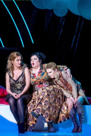 Alle Mitwirkenden sangen übrigens mit Mikroports. Der Vorteil gegenüber einer üblicher Weise 3 ¾ Stunden dauernden Aufführung dieser Fassung der Oper lag in der stärkeren Konzentration auf lediglich drei Paare in diesem Bäumchenwechseldichspiel unter Verzicht auf die Diener- und Götterebene, was Monteverdis Oper auch in der heutigen Zeit unter Einbeziehung einer moderat modernen musikalischen Aufbereitung auch für ein größeres Publikum anhörens- und ansehenswert macht. Ich hatte bei Betrachtung des Streams den Eindruck, dass im Theater nur eine kleine Anzahl von Zusehenden, geschuldet den strengen Corona Maßnahmen, die auch das Kulturleben in Budapest bestimmen, saß. Obwohl Monteverdi nicht gerade zu meinen Lieblingskomponisten zählt, muss ich gestehen, dass diese gekürzte und musikalisch aufbereitete Fassung auch mir gefiel.