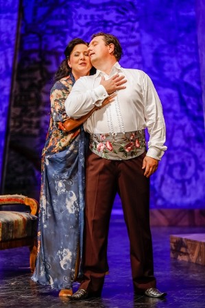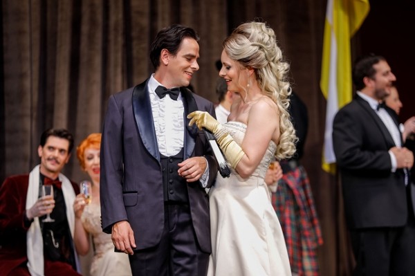 Nun aber zu den Sängern der Aufführung und da gibt es ebenfalls Gutes zu berichten. Ein Ausfall ist nirgends zu verzeichnen, auch die kleinsten Rollen sind rollendeckend besetzt und man hat auch den Eindruck, dass es dem Ensemble Spaß macht hier zu agieren. Die Spiel- und Sangesfreude vermittelt sich unmittelbar dem gut mitgehenden Publikum, welches Spaß an der einfühlsamen Geschichte der reichen Witwe hat. Als Hanna Glawari ist die gebürtige Schweizerin Maya Boog unumstritten die Nummer Eins unter den Gesangsdarstellern. Sie kokettiert auch mit Stimme und Darstellung. Ihr aufblühender Sopran hat klare ungefährdete Höhen und weiß sich auch in den Duetten hervorragend zu behaupten. Dazu kommt ein gefälliges Spiel, so dass die Gesamtfigur Hanna zum Mittelpunkt der Operette wird. Voller Energie, mit mühelos erklommenen Spitzentönen, tragfähigem leuchtenden kraftvollem Sopran stellt sie vor allem eine Figur aus Fleisch und Blut auf die Bretter, die die Welt bedeuten. Eine Hanna zum Anfassen, mit natürlicher Energie und kraftvoll leuchtenden Tönen. Dazu kommt ihr kongenialen Partner als Graf Danilo Danilowitsch, der wohlbekannte österreichische Tenor, der aus Tirol stammende Reinhard Alessandri. Er zeichnet das Bild des charmanten Schwerenöters, dem Arbeit einfach zuwider ist, der sich die Grisetten aber zum Lebensinhalt erkoren hat und die nach wie vor flammende Liebe zu Hanna, die neu entfacht wird, als sie nun als lustige Witwe auftaucht. Stimmlich und optisch ist er eine Idealbesetzung des leidenschaftlichen Lebemanns, dem der Champagner besser schmeckt wie die Arbeit. Durchschlagskräftig, mit leuchtender, fester und strahlender Höhe versehen, ist er der Lebemann, den die Liebe zu Hanna erneut packt. Als Valencienne, die treue-untreue Frau des Baron Zeta macht die Österreicherin Martha Hirschmann, eine sehr gute Figur. Ihr beweglicher, sicherer und effektvoll eingesetzter Mezzosopran weiß zu gefallen, im Grisettenlied wäre etwas mehr Durchschlagskraft noch besser gewesen. Mit ihrem frivolen und aufreizenden Spiel bringt sie den Puls vieler im Publikum sitzender Herren zum schnelleren Schlagen. So mancher möchte da an Stelle des Camille de Rosillon sein, der von dem brasilianischen, aus Rio de Janeiro stammenden Tenor Gustavo Quaresma verkörpert wird. Er hat eine mühelose, metallische, alle Höhen ohne Probleme meisternde Stimme, die sowohl im Solo, als auch im Duett durchschlagskräftig ist. Seine bombig herausgesungenen Spitzentöne beeindrucken. Zwei Paare auf der Bühne, die sich in nichts nachstehen, ein Glücksfall für Baden und das begeistert mitgehende Publikum.