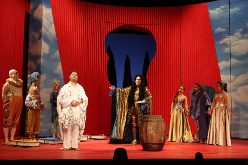 Die solistische Besetzung konnte sich auch sehen und hören lassen. In der Titelrolle gab die koreanische „Allzweckwaffe“ des Halleschen Ensembles, Ki-hyun Park mit voluminös strömendem Bass und komödiantischem Spiel die Pantalone-Figur des Socrates. Unter seinen Schülern, die als tunichtgute Sprösslinge reicher Familien aufgefasst werden konnten, tat sich lediglich Christopher O’Connor als Pitho mit sauber geführtem Tenor solistisch hervor. Die anderen drei (Andreas Guhlmann als Alcibiades, Kristian Giesecke als Xenophon und Till Voß als Plato) sangen ihre schauspielerisch burlesken Einsätze im Ensemble. Gleich zwei Paare guter Sopranistinnen werden im geduldigen Sokrates benötigt, einmal in den komischen Rollen von Xantippe und Amitta; dann in den lyrischen Rollen der Prinzessinnen Rodisette und Edronica. In beiden Fällen hoben sich die Sängerinnen durch ein jeweils etwas helleres und dunkleres Timbre voneinander ab. Das komische Paar kam naturgemäß erst einmal spitz zankend und kreischend auf die Bühne. Die gingen sich sehr naturalistisch an die Wolle. Die Xantippe der Anke Berndt behielt einen etwas spitzen Nebenton in ihrem kräftigen Sopran bei. Als Amitta kehrte das frühere Ensemble-Mitglied Melanie Hirsch nach Halle zurück; ihren etwas dunkleren Sopran brachte sie virtuos, beweglich, frisch und klar zur Geltung.