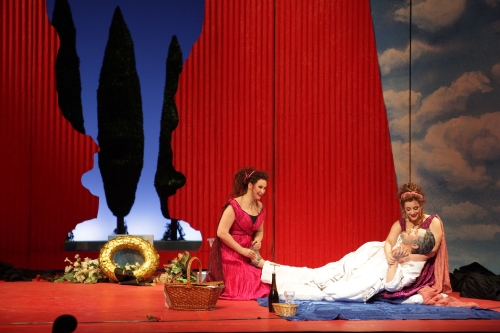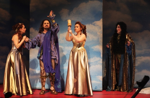 Die beiden Prinzessinnen ließen sich zur Unterstützung beim Buhlen um den unentschlossenen Prinzen Melito von darstellenden Künstlern konterfeien, einem Maler und einem Bildhauer. Dabei schummelte die Rodisette etwas mit ihrer Oberweite. Um die Spannung aufrechtzuerhalten wurden die beiden „Kunstwerke“ den Zuschauern erst zum Schluss ersichtlich gemacht: da hatte dann Edronica mit ihrem Oberkörper noch mehr übertrieben. Stimmlich konnten beide mit klaren, schlanken Höhen und beweglichen Koloraturen aufwarten; mit der leichten Eindunkelung wirkte Frau Schröder etwas erotischer. Den unentschlossenen Liebhaber beider, den Prinzen Melito sang der australische Tenor Michael Smallwood mit beweglichem, sauber geführtem Tenor von schöner Leuchtkraft und spielte ihn überzeugend. Der zuerst verschmähten Liebhaber, der Prinz Antippo war als Hosenrolle mit der Altistin Julia Böhme (Es gibt zwei Sängerinnen dieses Namens; diese ist die Richtige: http://juliaboehme.de/ ) idealtypisch besetzt. Mit knabenhaft schlankem Körper und ebenso schlankem und klarem Alt bietet sie sich geradezu für Hosenrollen in Barockopern an. Ásgeir Páll Ágústsson gab den Fürsten Nicia schön komödiantisch aufgedreht mit wohltönendem Bass. — Aus Anlass der Befreiung des schönen Jünglings aus dem Schoße der Proserpina wurde als kleine Einlage das Adonisfest aufgeführt, zu welchem selbiger in Kurzeinlagen von Jonathan dos Santos getanzt wurde. Paul Eisenmann mit Knabensopran piekte zum Schluss als Cupido die Szene auf, damit nur ja keiner unverliebt bleibe.