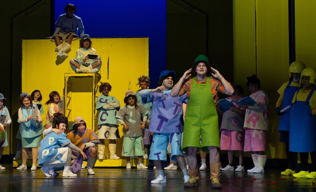 Der Anhalter wird zum Conférencier, der nacheinander vier Kinder – Hannah, Otto, Aziza und Natan – durch verschiedene Tricks mit Superkräften versieht; Hannah durch das Blut eines Vogels (Siegfried und Fafner lassen grüßen), dass Flug- und Koloraturkräfte verleiht. Allen vier Kindern ist gemein, dass sie zuvor von anderen Kindern gemobbt werden und dieses und später auch die Heldentaten mit Tablets mit Kirsch-Logo (Apfel ist bekanntlich markenrechtlich schon vergeben) der ganzen Welt wissen lassen. Und ihnen ist gemein, dass ihre Namen Palindrome sind, sich also rückwärts genau so lesen lassen. Dann bekommen sie vom Anhalter eine Mission: Die blaue Sau, die im Schwebeland entführt wurde, vor den Schurken zu retten. Diese sind typische Comic-Figuren: Käpt´n Flughörnchen, Giganta, Dampfflammator und Robomat Drilling, die ihr Schäbomobil versuchen unter Kontrolle zu bekommen. Es kommt zum großen Kampf, mit dem die Oper beginnt. Die Kontrahenten erkennen sich dabei quasi als Doppelgänger, die allesamt vom Anhalter verführt wurden. Der benutzt sie nämlich, um als Oberbösewicht an den Speck der blauen Sau zu kommen. Natürlich wird die blaue Sau, die nur eine animierte Zeichnung bleibt, gerettet und in ihr Schwebeland entlassen, damit die vieldimensionale Welt wieder ins Gleichgewicht kommt. Das Alles folgt jetzt nicht unbedingt logischem Sinn (typisch Oper), hat aber Anleihen an Kinder- und Jugendserien und Comics und holt das junge Publikum eher ab als Vogelhändler, Hexen oder Taumännchen. Fantasie und Wortwitz gehen Hand in Hand, um das junge Publikum bei Laune zu halten. Der ganze Text ist gereimt (und als Übertitel mitlesbar), wobei Sprüche wie „Abgelenkt – Kiefer verrenkt“, „Mach dich vom Acker, sonst Massaker“ oder „Auf den Otto mit Gebrüll, denn auch er ist Sondermüll“ auf Schulhöfen abgehört sein dürften (allerdings nicht Grundschule, wie aus zuverlässiger Quelle zu erfahren ist).