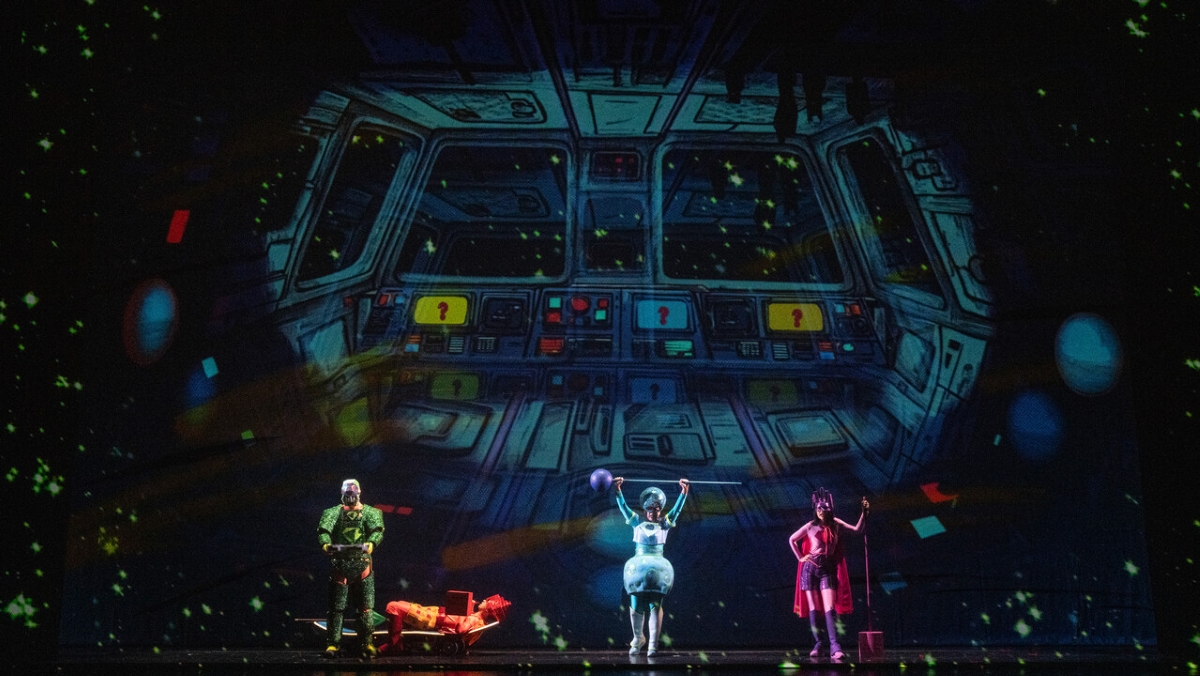 Gewöhnlich werden junge Leute mit Klassikern wie Zauberflöte oder Hänsel und Gretel in die Welt der Oper eingeführt (oder, wie der Rezensent schon mehrfach erleben durfte, erfolgreich mit Werken Richard Wagners). Mittlerweile gibt es Werke, die unter der Gattung Familienoper diese Zielgruppe direkt anspricht, oft mit aktuellen Themen und mit einer Musiksprache, die eingängig, aber raffiniert gesetzt ist, eindrucksvoller, aber nicht überwältigender Bühne und die für das singende Personal mehr Herausforderungen bieten als ein Musical. Ein solches Werk ist die Superheldenoper Die blaue Sau, die jetzt von der Deutschen Oper am Rhein in Duisburg gespielt wird, und zwar als Übernahme von der Oper Bonn, wo sie 2015 uraufgeführt wurde. Die tosende Begeisterung des jungen Duisburger Publikums am Dienstagvormittag bestätigt die Existenzberechtigung dieses Werkes. Natürlich geht es auch hier im Libretto von Jürgen R. Weber darum, dass man als Einzelner machtlos ist, aber im Team das Böse besiegen kann und dabei unglaubliche Abenteuer erlebt. Das Publikum wird zunächst hineingeworfen in einen intergalaktischen Kampf merkwürdiger Gestalten gegen ein von oben schwebendes Mädchen. Ein großes, rundes, blaues gezeichnetes und animiertes Gesicht auf den Gazevorhang projiziert ist die blaue Sau, die von den Bösewichtern attackiert und von dem Mädchen verteidigt wird. Dazu werden lautmalerische Comic-Ausdrücke wie Smash, Boom, Clash projiziert. Break, Auftritt des Anhalters, eines in grauen Anzug mit gelben Nadelstreifen gekleideten Mannes mit zwei ebensolchen Begleitern. Der (Anhalter!) hält die Zeit an, dreht sie zurück und lässt die Geschichte von vorne beginnen.