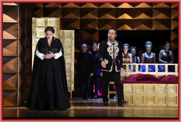 Zwischen diesen beiden Szenen liegen rund 3¼ Stunden ansprechender Opernunterhaltung. Gleich zu Beginn werden die wichtigsten Personen vorgestellt, ein weiterer dramaturgischer Vorteil der Mailänder Fassung, die Guy Joosten sehr genau und mit guter Personenregie zeichnet. Phillip II. ist ein fast bemitleidenswerter Herrscher, der von seiner Frau nicht geliebt wird und feststellen muss, dass er gegen die Inquisition nicht viel zu sagen hat. Sehr schön in diesem Zusammenhang auch das Bühnenbild von Alfons Flores, eine Palastkulisse aus vielen goldenen Elementen, die meist strahlend leuchtet, je nach Lichteinfall (Licht: Manfred Voss) aber auch durchsichtig werden kann. In diesen Gemäuern sind im Laufe der Inszenierung immer wieder Mönche an den verschiedensten Stellen zu sehen, die symbolisch den Palast rund um die Uhr überwachen und alles im Blick haben. Beindruckend durch geschickten und spärlichen Einsatz von Projektionen ist auch der Effekt zum Ende des zweiten Aktes, bei dem die flandrischen Deputierten im Autodafé den Flammen zum Opfer fallen.