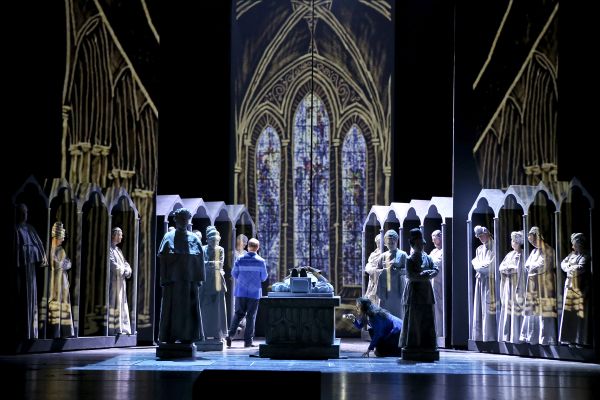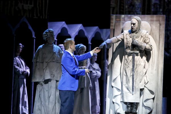 Doch zuerst kurz zur Geschichte: Jon Whitcroft wird von seiner Mutter und seinem Stiefvater ins Internat nach Sailsbury geschickt, wo er sich mit Angus und Stu nun ein Zimmer teilt. Während einer Geschichtsstunde bei Mr. Rifkin platzt plötzlich der Geist von Lord Stourton samt seiner dämonischen Gehilfen herein, die allerdings nur von Jon gesehen werden. Die übrigen Mitschüler halten Jon dagegen für verrückt, rennt er doch wie wild durchs ganze Klassenzimmer. Nur Ella glaubt ihm und nimmt Jon mit zu Ihrer Großmutter Zelda. Hier finden die beiden heraus, dass Lord Stourton 1557 gehängt wurde, da er William Hartgill getötet hat. Seitdem will er sich an allen männlichen Hartgills rächen, zu denen auch Jon gehört, da seine Mutter eine geborene Hartgill ist. In der Kathedrale von Sailsbury treffen Jon und Ella auf die Statue des Ritters William Longspee, die plötzlich zu leben erwacht. Longspee verspricht die beiden im Kampf gegen Stourton zu unterstützen, wenn sie ihm im Gegenzug helfen sein Herz zu finden, welches an falscher Stelle begraben liegt. Hieraus entwickelt sich die Geschichte, die in der Oper leider sehr schnell voranschreitet, bleiben hier ja auch nur zwei Mal rund 50 Minuten Zeit. Sehr schön anzusehen sind hierbei die gelungenen Kostüme von Kristopher Kempf.