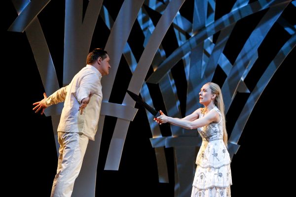 Diese handelt von der Tochter des kretischen Königs Minos, die sich auf den ersten Blick in den Athener Theseus verliebt, der gekommen ist um zusammen mit seiner begleitenden Mannschaft den Minotaurus zu besiegen. Wie bereits vor der Pause spielt auch hier die Liebe eine große Rolle, die besagten Theseus kurzzeitig dazu bringt, seine eigentliche Aufgabe aus den Augen zu verlieren. So spannt sich ein interessanter thematischer Bogen zwischen den zwei Werken. In der Rolle der Ariadne glänzt die Sopranistin Heidi Elisabeth Meier, wofür sie am Ende begeisternd vom Duisburger Publikum gefeiert wird. Ihr zur Seite steht Laimonas Pautienius als Theseus. Gut besetzt auch die weiteren größeren Rollen mit Luis Fernando Piedra als Theseus Freund Burun und Lukasz Konieczny als Minotaurus. Die fünf Jünglinge haben wenig zu singen und werden in der Inszenierung von Kinga Szilágyi durchaus auch für komödiantische Momente eingesetzt, sehr nett wie sie zusammen das Schiff formen mit dem Theseus übers Meer fährt oder wie sie das Labyrinth zum Minotaurus bilden, indem sie sich immer wieder neu die Hände reichen und so stets neue Wege schaffen, durch die sich Theseus kämpfen muss.