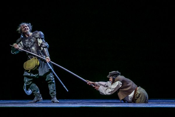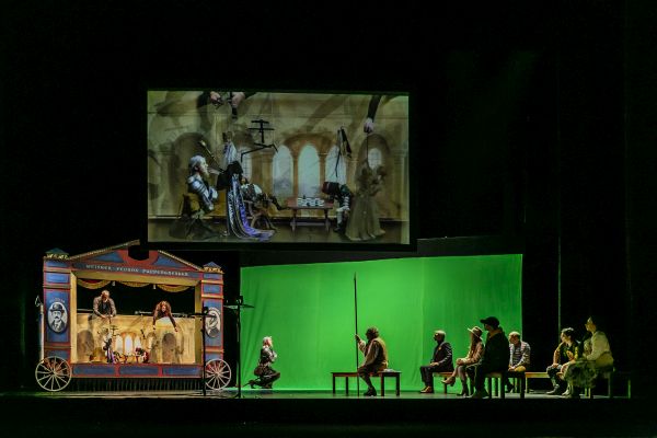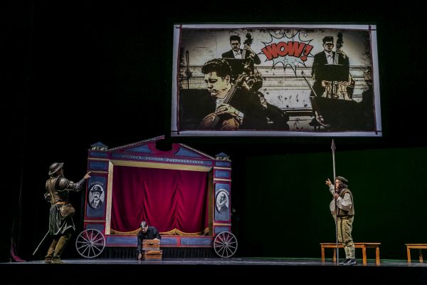 Mit einer gesamten Spielzeit von rund 45 Minuten richtet sich das Werk vor allem an junge Zuschauer. Die Einführung zum Stück wird entsprechend kindgerecht gestaltet und auch die Inszenierung von Torge Möller und Ilaria Lanzino ist speziell auf dieses Publikum ausgelegt. Sehr gut gelungen ist hierbei die Integration des Marionettentheaters unter der Leitung von Anton Bachleitner, der die Figuren zusammen mit Anna Zamolska zum Leben erweckt. Im Übrigen ist es aktuell nahezu die einzige Gelegenheit, das Düsseldorfer Marionettentheater live zu erleben, da sie in ihrem eigenen kleinen Theater derzeit nach wie vor nicht spielen können. Die Einarbeitung der Greenscreen-Technik, mit dessen Hilfe Don Quijote in die Welt des Puppenspiels eintaucht, ist zweckmäßig. Allerdings hat man dies in den letzten Monaten an anderer Stelle auch schon deutlich effektvoller erleben dürfen. Dafür spielen die Duisburger Philharmoniker unter der musikalischen Leitung von Ralf Lange in gewohnter Qualität. Auch die Darsteller sind gut ausgewählt, Jake Muffett überzeugt als spanischer Ritter Don Quijote, an seiner Seite steht Frank Schnitzler als leicht tollpatschiger, aber liebenswerter Sancho Pansa in einer stummen Rolle. Johannes Preißinger als Meister Pedro und „Sein Junge“ Sander de Jong, sind leider akustisch nicht immer gut zu verstehen und da die Übertitel bei der Duisburger Premiere erst nach der Hälfte der Vorstellung einsetzen, erleichterte dies die Sache nicht zwingend. Da die Handlung aber recht einfach gehalten ist, ist dies zu verschmerzen. So fühlten sich die Erwachsenen in dem Fall wie die Kinder, die die Übertitel sowieso ignorierten. Gesanglich waren die drei Interpreten dagegen tadellos unterwegs.