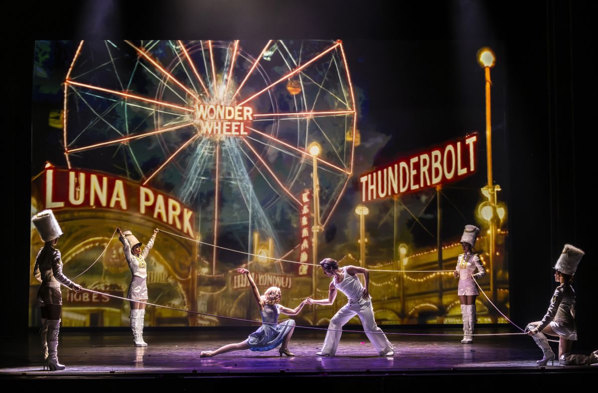 Trotz des bereits erfolgten Lobes für die gesamte Produktion ist das Highlight des Abends das Bühnenbild von Momme Hinrichs. Es zeigt New York wie durch eine Fotolinse, die sich immer wieder öffnet und schließt. Durch verschiebbare Wände entstehen so immer wieder sehr flüssig neue Räume, was die schnellen Ortswechsel im Musical optimal unterstützt. Gleichzeitig entsteht auf diese Weise im übertragenen Sinne eine Art Fotoalbum mit verschiedenen Bildern aus New York. Große Videoprojektionen mischen sich hierbei wie selbstverständlich mit echten Requisiten auf der Bühne und erzeugen so einen ganz eigenen Reiz. Beispielhaft sei an dieser Stelle die Taxifahrt durch New York genannt, bei der sich ein drehbares Yellow Cab sehr unterhaltsam durch die Straßen von Manhattan bewegt. Effektvoll ist auch die längere U-Bahn-Fahrt nach Coney Island gegen Ende des Stücks, die zweimal ganz unterschiedlich dargestellt wird. Während Gabey bei der Fahrt einschläft und sich daraus das Coney Island Traumballett ergibt, sitzen seine Freunde in einem U-Bahn-Waggon, der in der Bühnenmitte steht. Währenddessen zieht die dunkle Röhre in Form von Videoprojektionen an ihnen vorbei. In diese Szene integriert Louisa Proske geschickt einen zeitlosen Aspekt: Im Zug kommen und gehen Passagiere ins Abteil, die in ganz anderen Zeiten mit eben dieser U-Bahn aus dem Trubel der Stadt herausfahren. Darüber hinaus stecken im Bühnenbild viele liebevolle Details, was gleich zu Beginn des Abends sichtbar wird. Nachdem Gabey, Chip und Ozzie durch das Hafentor auf die Straße getreten sind, rollt der Zaun nach links von der Bühne ab, während im Hintergrund die Videoprojektion des Hafens mitwandert. So entsteht der Eindruck, dass die drei einen längeren Weg entlang des Zauns zu einer U-Bahn-Station laufen. Diese wird durch einen weiteren Durchbruch im Zaun dargestellt. Gleichzeitig sorgt eine Treppe zur Unterbühne dafür, dass weitere Einwohner New Yorks wie selbstverständlich durch das Tor zur U-Bahn herunter gehen bzw. aus dieser heraus auf die Straße treten. Auch in der U-Bahn selbst wackeln später während der gesamten Fahrt die Haltegriffe hin und her, was für eine authentische Atmosphäre sorgt.