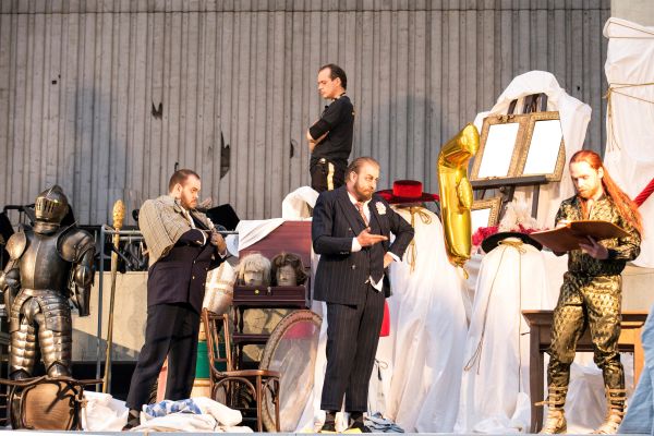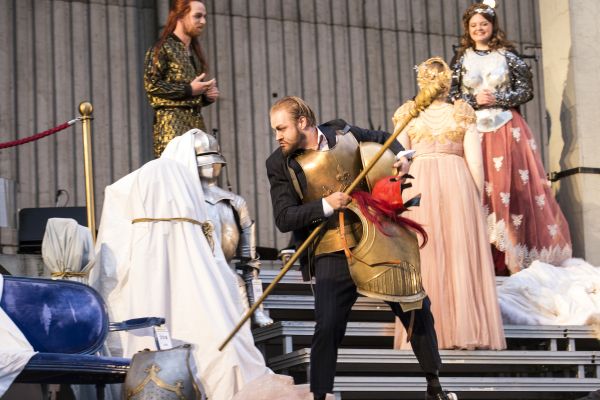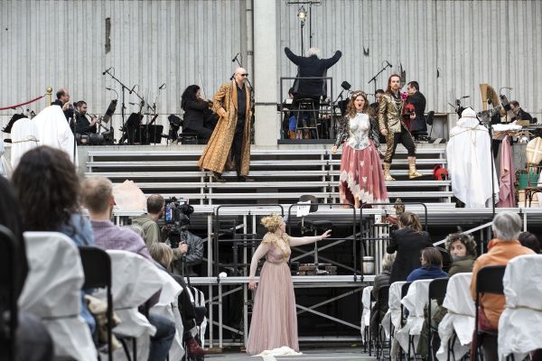 Es gibt ein Leben ohne Oper und sogar, im Unterschied zu dem ohne Möpse, ein lebenswertes, aber um ein wie viel reicheres Dasein es sich mit Oper handelt, konnte man am 12.6., genau dem Tag, an dem der neue Ring der Deutschen Oper in der Regie von Stefan Herheim mit Das Rheingold seine Premiere haben sollte, auf dem Parkdeck des Hauses mit einer ganz besonderen Aufführung des Vorabends der Tetralogie erleben. Mit einem Konzept und der halbszenischen Einrichtung des Rheingold von Neil Barry Moss, von Jonathan Dove und Graham Vick für die Birmingham Opera Compagny verkürzt auf knappe zwei Stunden, zweier Partien, der des Mime und des Froh, beraubt und mit 22 anstelle der über achtzig Orchestermitglieder, so dass quasi jeder der Musiker zum Solisten mutierte, wurde es ein erfüllter und erfüllender Abend, den auch Alberich mit dem schrecklichen Fluch eines drohenden Unwetters nicht verhindern konnte. Erst zehn Tage vor der Premiere hatte der Senat die Aufführung genehmigt, je drei weiß verhüllte und damit nicht besetzbare Stühle standen zwischen den Sitzgelegenheiten, und auch auf der kleinen Bühne vor dem Orchester waren Requisiten unter weißen Tüchern verborgen, als sollten sie eine Reminiszenz sicher an Corona-Auflagen, aber auch an den Götz-Friedrich-Ring sein, der mit ebensolchen Gestalten begann und endete (Bühne Lili Avar).