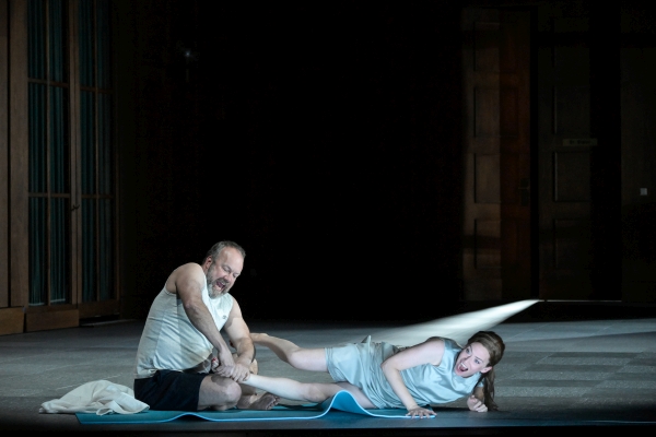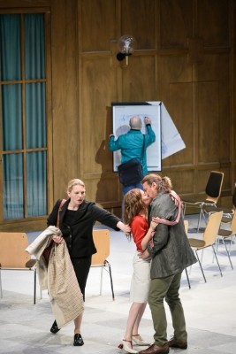 Oft kommt es nicht so schlimm, wie es Vorabäußerungen befürchten ließen, und diese Hoffnung nährte auch die Rezensentin, bis ihr, sicherlich als eine freundliche Geste und Zeichen der Fürsorglichkeit gedacht, die Pressestelle vorab das Programm zu den Meistersingern zuschickte. Darin befindet sich auch eine „Inhaltsangabe“ von Jossi Wieler, in der zu lesen ist: „In Dr. Pogner’s (falsch gesetzter Apostroph) Privat-Konservatorium. Pogner möchte das von ihm gegründete und geleitete Institut der öffentlichen Hand übergeben…..Sein Nachfolger muss in die Ehe mit seiner Tochter Eva einwilligen, über die er die Geschicke des Instituts auch nach seinem Rückzug mitzugestalten gedenkt. Dass Eva ein heimliches Verhältnis mit dem an seinem Institut angestellten Musik-Dozenten und Therapeuten Hans Sachs pflegt, weiß er nicht.“ Der Schluss der „Inhaltsangabe“ lautet: „Walthers Vortrag entzückt alle Anwesenden, doch die Pogner-Nachfolge schlägt Walther aus.“ Da wurde flugs aus einer schlüssigen, interessanten, historisch und geographisch solide verankerten Geschichte eine trübe Vorlage für eine RTL-ZWEI-Reality-Show.