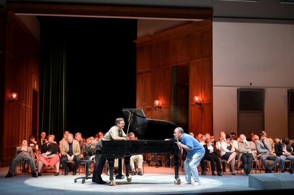 Der Einheitsschauplatz für Kirche, Johannisnacht, Schusterstube und Festwiese ist ein nüchterner Mehrzweckunterrichtsraum im Stil der Dreißiger, in dem man auch noch den Flügel aus dem Ring unterbringen konnte, die Kostüme könnten aus dem Fundus sein, voriges Jahrhundert, bunt und in keiner Weise unverwechselbar. Für beides werden nur Ko-Bühnenbildner bzw. Ko-Kostümbildnerin angeführt. Dafür gibt es neben Jossi Wieler mit Anna Viebrock und Sergio Morabito noch zwei weitere für die Inszenierung Verantwortliche.