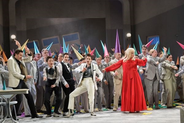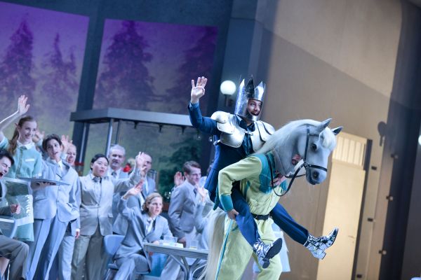 Einen kleinen Schock bereitet mit ihrem ersten Auftritt Clémentine Margaine als Dulcinée, so sehr ist seit ihrem letzten Auftritt ihre Figur aus den Fugen geraten, und aufatmend stellt man fest, dass sie sich wohl in bereits weit fortgeschrittenem Stadium froher Erwartung befindet. Eine leichte Kurzatmigkeit und eine brustige Tiefe ist wohl dem bevorstehenden freudigen Ereignis geschuldet, ansonsten kann man sich, ganz besonders in der elegischen Arie im vierten Akt, wieder an dem Ausnahmetimbre, der Eleganz des Singens und der starken Bühnenpräsenz erfreuen. Das Quartett der Räuber bzw. Kavaliere ist mit dem Sopran Alexandra Hutton, dem Mezzo Cornelia Kim, dem Tenor Samuel Dale Johnson und ganz besonders dem Bariton James Kryshak vorzüglich besetzt. Der Chor unter Jeremy Bines macht optische Eintönigkeit durch farbiges Singen wett.