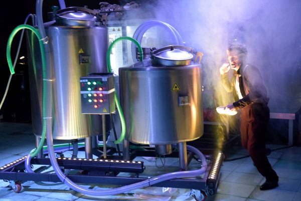 Ein Riesenkessel wird herbeigeschafft, die Ingredienzien für den Kunstmenschen hineingeworfen, viel Dampf aus Trockeneis erzeugt und das arme Monster total vergessen, denn eigentlich scheint es den Schöpfern des „Musiktheaters“ erst einmal eher um die vorgetäuschte Kinderlosigkeit des Ehepaars Percy und Mary Shelley (ein Kind erreichte immerhin das Erwachsenenalter) zu gehen als um Wohl und Wehe des künstlichen Menschen ohne Gefährtin. So erleben die Zuschauer Zeugungsakt, Geburt und frühen Tod des leiblichen Kindes, weitere Zeugungsversuche, deren Ergebnislosigkeit die Gattin höhnisch mit dem Hin- und Herschwenken eines blutigen Tampons verkündet, und schließlich die Selbstbefruchtung des Mannes (das Programm spricht von „Gebärneid“), die zur Geburt eines ähnlich seltsamen, wenn auch nicht unsympathischen Wesens führt, wie es auch das Kind beider Gatten war. Reichlich unmotiviert sitzen am Bühnenrand zwei unförmige Stoffpuppen als Monster und Gefährtin. Die Tragik des Frankensteingeschöpfs, das unschuldig schuldig wird und sich schließlich selbst verbrennt, bleibt völlig außen vor. Ein Wesen mit Boris-Karloff-Maske taucht nur kurz und unmotiviert auf.