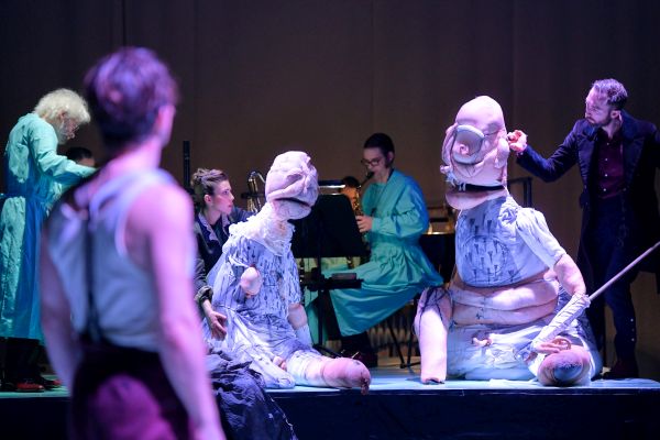 Angeregt wohl von der Tatsache, dass der Untertitel von Shelleys Roman sich auf Prometheus bezieht (am Schluss fällt ein eher Geier als Adler vom Himmel, um in die bereitwillig dargebotene Leber des neuen Menschenschöpfers zu hacken), zitiert man Goethes berühmte Ballade, was der beste Teil des Abends ist, des weiteren bedient man sich Rameaus („Fatal Amour“) und des Doppelgängers aus Heines/Schumanns „Dichterliebe“. Es gibt auch einen Komponisten, der diese Musikstücke bearbeitete (für ein Orchester, das laut Programmheft aus „verstimmtem Klavier, Harmonium, Celesta, Cello, Klarinette, Saxophon, Schlagzeug, singender Säge“ besteht und von Jens Holzkamp, mit Sir-Simon-Rattle-Frisur und wie seine Musiker im grünen Arztkittel geleitet) und Eigenes schuf auf Texte von Marius von Mayenburg, John Milton und Goethe schuf, nämlich Gordon Kampe.
