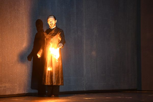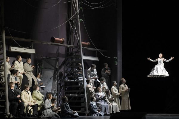 Regisseur Pelly, der viel mit Licht und Schatten spielt und seiner Lesart des Stoffes damit viel Traumhaftes und Rätselhaftes verleiht, spart aber auch nicht an den dafür geeigneten Stellen der Oper, das Humoreske dieser Handlung herauszustellen. Insbesondere ist dies der Fall, als Olympia ihre berühmte Arie singt, und die Darstellerin dieser Partie, Cristina Pasaroiu, mit einer Bühnenhebevorrichtung über die Szenerie schwebt und am Ende des Les oiseaux dans la charmille kommen sogar die Bühnenarbeiter aus ihrer Deckung und schieben sie soweit es geht über den Orchestergraben in Richtung Publikum; dafür ernten Sie Extraapplaus. Das die Künstlerin dann natürlich beim letzten Spitzenton umjubelt wird – wen wunderst – war berechtigterweise zu erwarten. Aber das war nur eine der vielen Regieeinfälle, mit den Pelly das Publikum überrascht und im besten Sinne des Wortes, unterhält. Nicht zu vergessen: Licht: Joël Adam / Video: Charles Carcopino. Als ein weiteres Beispiel, diesmal mit mehr Dramatik, sei hier das Schattenspiel des Dr. Miracle zu erwähnen, der quasi mit Geisterhänden die Tür zur Kammer der todgeweihten Antonia öffnet.