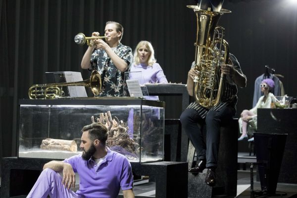 Erstaunliches hat sich im Werkstatttheater der Deutschen Oper, der ehemaligen Tischlerei, getan: Die hässlichen Wände sind rundum mit Gazeschleiern verhüllt, die Zuschauer sitzen an den beiden Längsseiten auf Podesten, die sich nach rechts und links bewegen lassen, die Bühne befindet sich in der Mitte, und die Zuschauer fahren quasi an der Behausung für das Personal von Wir aus Glas auf und ab, sehen sich mal dem Vorgärtchen mit frisch gepflanztem Bäumchen, mal der Garderobe, der Bar, dem Esstisch, dem Schlafzimmer oder dem Bad gegenüber (Szene Jo Schramm). Hier wohnen fünf Personen, zwei Paare und ein Fünfter, davon vier Sänger und ein Schauspieler, der zunächst einer der Ehemänner ist, dann aber von dem vierten Sänger als solcher ausgebootet wird. Zwischen den handelnden Personen wandeln die Orchestermitglieder, auch sie in Kostümen, so die Geige mit Duschhaube, Hot Pants und Sonnenbrille, schließlich hält sie sich vorzugsweise im Bad auf, was Geigen eigentlich nicht gut bekommen soll. Ein schweres Schicksal verbindet die Fünf mit einander, denn sie müssen Tag für Tag und Nacht für Nacht in eintönigem Rhythmus immer dasselbe vollführen, oft Müsli essen, auch mal aufs Klo gehen, nur einmal in der Woche sich ein Festessen zubereiten.