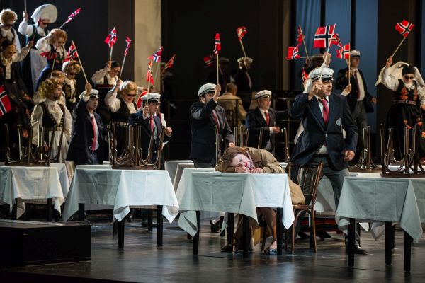 Bereits vor Beginn und zwischen den Akten sieht man das Gesicht Wozzecks, d.h. Johan Reuters, riesig auf den Vorhang projiziert und traut ihm die Wehr- und Hilflosigkeit, das Vergrübelte und Wahnvorstellungen Verfallene nicht zu, dem Sänger wird dadurch eine glaubhafte Verkörperung der Figur eher schwerer gemacht als erleichtert. Durch die Verlegung in die Jetztzeit geht auch die Alternativlosigkeit seines Schicksals verloren. Und den fröhlich die norwegischen Fähnchen schwingenden Choristen mag man erst recht nicht die Grausamkeiten und Obszönitäten zuschreiben, die sich auf der Bühne abspielen.
