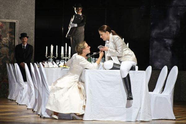 Die Idee zum Rosenkavalier entstand im Februar 1909 in Weimar. In einem Brief skizzierte Hugo von Hofmannsthal Richard Strauss seine ersten Ideen dazu. Rechtzeitig zum 150. Geburtstag des Komponisten (der hier übrigens 1889 Kapellmeister wurde) brachte das Deutsche Nationaltheater Weimar eine Neufassung dieses Publikumsrenners auf die Bühne. Vera Nemirova, in Wien durch ihre wenig geglückten Inszenierungen von Pique Dame und Macbeth einschlägig bekannt, führte dabei Regie. Und sie bringt uns (man will schon fast sagen natürlich) von der Ära Maria Theresias in eine unbestimmte Zeit: Die Kostüme von Tom Busch, der auch für das Bühnenbild verantwortlich zeichnet, schwanken zwischen ausgeflipptem Heute (dazu passen auch die sensationslüsternen Protagonisten, die mit Handys immer wieder Schnappschüsse von kompromittierenden Szenen machen) und dem Fin de Siècle, wie sich etwa am Reitrock und den Breeches von Octavian erkennen lässt.