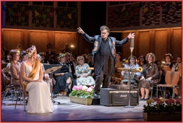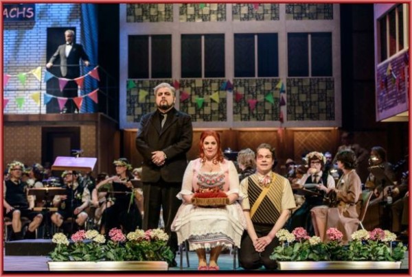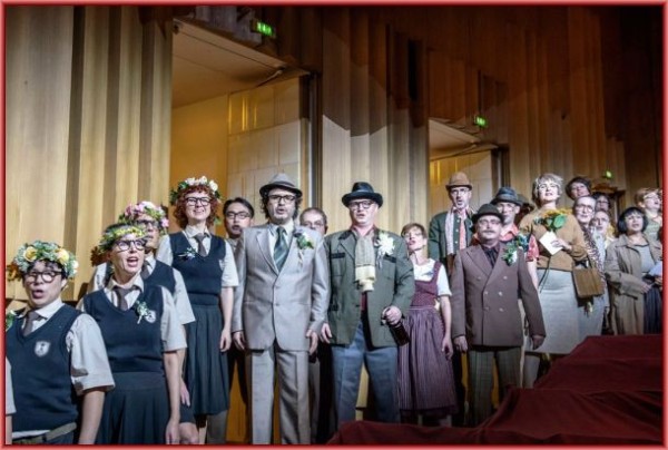 In einer packenden Inszenierung von Vera Nemirova wird derzeit ‚Meistersinger‘ in einer Coproduktion der Städte Erfurt und Weimar gegeben. Die Handlung wird in die Nachkriegszeit verlegt, ansonsten interpretiert Nemirova das Stück ganz aus sich selbst heraus, wenn sie dabei auch zu eigenwilligen Schlüssen kommt. Zum Vorspiel schaut sich ein Publikum in einem einfachen längsgeschnittenen braunverkleideten Saal (Bühne: Tom Musch) Dokumentarfilme aus der Nazizeit und aus dem 2.Weltkrieg an, was auch zu heftigen Bewegungen innerhalb der Stuhlreihen führt. Nach Absingen des Chorals konfrontiert David Stolzing mit den ausgepichten Regeln des Meistergesangs.