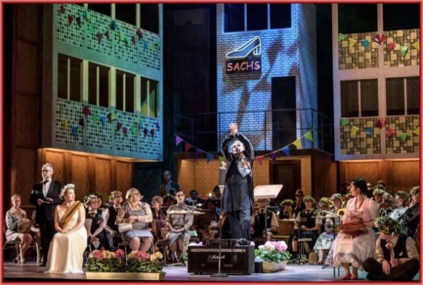 Während der Ansprache Pogners fühlen sich die Meistersinger plötzlich wie im Fitnessstudio und jeder trainiert auf seine Weise in Sportklamotten. So fließen immer wieder moderne Aspekte in die Regie ein. Neben ihrer schwarzen (Regisseurs-) Einheitskluft haben die Meistersinger also auch schreiend türkisgrüne Trainingsanzüge im Schrank (Kostüm: Marie-Therese Jossen), in denen sie sich total verausgaben. Nur so können sie offensichtlich als gesellschaftliche Elite bestehen. Tom Musch führt seine Szenen fort, indem er eine Nachkriegsarchitektur als planlose Verbauung vorführt. Es handelt sich um vier rechteckige, echt trashige Häuser, darunter das Sachs-Haus mit Schriftzug und Neon-Damenschuh, rechts davon etwas größer das Pognerhaus mit einer Art Veranda als Balkon, die in der Innenszene auch als ‚Separé‘ für den Merker dient. Beim Vorspiel zum 3.Akt sind darin Orchesterpulte aufgestellt, und der Merker dirigiert das Vorspiel mit.