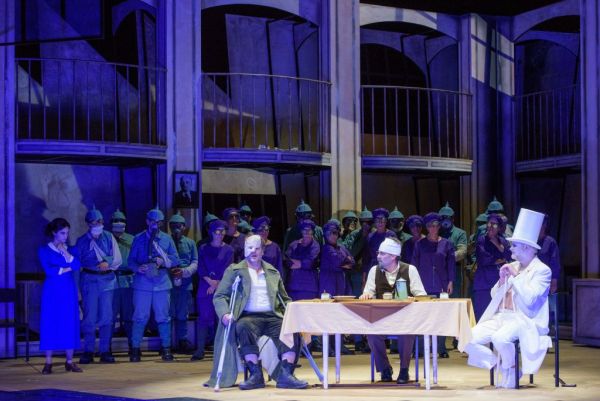 „Sphärenmusik“ sind vor allem auch die Stefan Lano komponierten Rilke-Lieder, die musikalisch hörbar von Alban Berg inspiriert sind. Gerade diese Musik schafft sehr stark diesen „überrealen“ Eindruck. Gelungen sind auch die Chorauftritte sowohl als Sprechchöre als auch mit diversen bekannten Arbeiterliedern. Andres Reukauf hat die Soldatenlieder arrangiert und Jens Petereit hat den Chor fit gemacht. Max Landgrebe als Friedrich Becker und Thomas Kramer als Maus spielen ihre Rollen treffsicher. Auch Simone Müller als Hilde ist eine Frau ihrer Zeit. Die anderen Rollen sind dann aber sehr typenhaft und wenig individuell präsentiert. Alles in allem ist „November 1918“ eine sehens- und auseindersetzungswerte Inszenierung. Bestens geeignet auch für Politiker, vor allem von der SPD. Gerade für das heutige Verständnis vom Ersten Weltkrieg als „Urkatastrophe“ des 20. Jahrhunderts liefert diese Uraufführung einen Einblick in die Mentalität der deutschen Besiegten. Döblin sah viele Zusammenhänge lange vor jeder historischen Analyse. Die DNT Weimar Uraufführung von Döblins „November 1918“ macht diese Zeit aus verschiedenen Perspektiven erlebbar. Das ist schon eine Leistung.