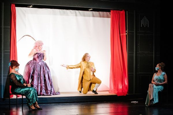 Die blaugekleideten Damen und zwei Herren des Opernchores sangen Puccinis „Coro a bocca chiusa“, den berühmten Summchor, aus „Madame Butterfly“, teilweise mit Mundschutz, begleitet von Yuka Beppu am Flügel, in durchsichtigem, reinem Klang in sehr guter Ensembleleistung. Bezüge zur Pandemie waren das angedeutete Anstoßen aus weiter Entfernung als Satire auf die gegenwärtigen Umstände. Marlene Gaßner als Antonias Mutter in schwarzem Kleid, Emma Moore als Antonia mit rosa Perücke und Frank Blees als Mirakel, seit 2007/08 Mitglied des Mecklenburgischen Staatstheaters Schwerin, im schwarzen Anzug, sangen Offenbachs „Tod der Antonia“ aus „Hoffmanns Erzählungen“. Moore agierte mit zarter, silbrig-glänzender leichter Stimme in glanzvoller Höhe, Blees überzeugte durch tiefe Kantabilität und sehr gute Diktion und Gaßner mit warmem erdigem Stimmklang. Heike Porstein sang die Arie der Gräfin Almaviva „Dove sono i bei Momenti“ in Mozarts „Le nozze di Figaro“ mit zartem, engelsgleichem himmlischem Gesang im weißen Hosenanzug, es begleiteten Johannes Huppach (Violine), Astrid Müller (Violoncello) und André Kassel (Cembalo). Porstein erzeugte einen schwebenden und leichten Klang, in makelloser Reinheit und Geschmeidigkeit.