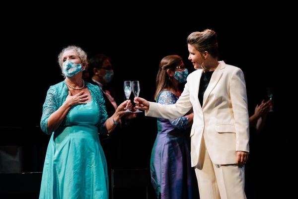 Der aus Gießen stammende Tenor Jörn Eichler, seit 2013/14 Ensemblemitglied des DNT, zeigte mit weniger Erfolg seine kompositorische Schaffenskraft. Er interpretierte „Auf Wiedersehen“ aus seinem Stück „Zu guter Letzt“ nach Texten von Wilhelm Busch gemeinsam mit einem Kammerensemble aus vier Musikern (Johannes Huppach – Violine, Magdalena Krömer – Violine, Neasa Ni Bhriain – Viola, Astrid Müller – Violoncello). Das langsame Stück, meist einzig begleitet durch zwei Violinen, sang Eichler in tenoralem Sprechgesang und deutlicher deutscher Diktion. In musikalischer und darstellerischer Hinsicht war es von großer Statik geprägt. Der Gefangenenchor aus Beethovens „Fidelio“, als Hinweis auf das ausklingende Beethovenjahr, in homogenem Wohlklang interpretiert durch zehn Herren vom Opernchor des DNT, betrat mit Zollstöcken die Bühne. Durch die reduzierte Besetzung und das fehlende Orchester wurde der Gefangenenchor in Kammermusik verwandelt. Eine interessante Erfahrung, die allerdings der derzeitigen Pandemiesituation geschuldet ist. Die kleinen Soli übernahmen in ausgezeichneter Interpretation der 1. Tenor des Chores Klaus Wegener und der Solo-Bass Andreas Koch. Durch die dezente Interpretation ohne großen Chor und Orchester wurde die musikalische Faktur mit allen Kompositionsschichten des Stückes deutlich. Der Gesang erklang fast A-capella, jeder Ton war zu hören, wie bei einem Kammerensemble. Die brillante Koloratursopranistin Ylva Sofia Stenberg begeisterte in Leonard Bernsteins „Glitter and be gay“ aus „Candide“ in goldenem Kleid mit schwarzer Federboa auf dem Kopf, durch große stimmliche Ausgeglichenheit, Leichtigkeit in allen Registern und brillant-glitzernde Höhe mit großartiger Bühnenpräsenz. Begleitet wurde sie durch Yuka Beppu am Flügel. Selbst bei bravourösen und schwindelerregenden Koloraturen konnte sie sich im Tanze wiegen, ohne sängerische Einbußen. In Mozarts „La Ci Darem La Mano“ aus „Don Giovanni“ (Premiere: 08.09.2018) agierten Bariton Máté Sólyom-Nagy als Don Giovanni in gelben Kniebundhosen, gelbem Frack und mit langen blonden Locken und Sopranistin Emma Moore als Zerlina, seit 2018/19 Mitglied des Ensembles, in lila Kleid mit Reifrock und mit rosa Haaren und langer Feder auf dem Kopf, begleitet von André Kassel am Cembalo, auf einer kleinen Barockbühne inmitten der Bühne in barocken Kostümen. Bariton Sólyom-Nagy glänzte mit voluminöser, sonorer Bassstimme. Ein sehr homogen gesungenes Duett, szenisch bereichert durch das Spiel mit der Feder, um die gegenseitige Nähe auch mit Abstand andeuten zu können.