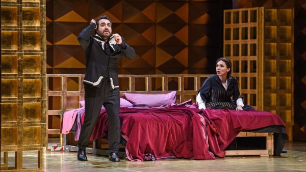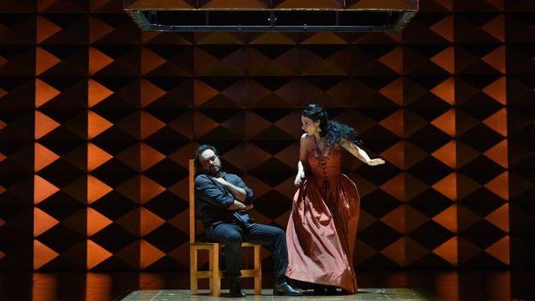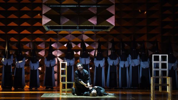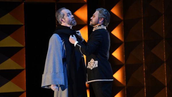 Anderes in Joostens Arbeit wird indes wirklich dringlich. Die von Alfons Flores gestaltete Bühne besteht aus wabenartig strukturierten, goldfarbigen, bei Bedarf durchscheinenden Wänden, welche der Szene einen immer wieder neuen Grundriss geben. Auch durch die architektonische Symmetrie wird Enge, Abgeschiedenheit und hohles Zeremoniell suggeriert. Immer wieder durchqueren Mönche die Bühne, wohl aus dem Umkreis des Großinquisitors stammend: die Kirche hat Augen und Ohren überall. Posas Übergabe von Carlos Billet an Elisabetta wird von den Hofdamen mit aufdringlicher Neugierde beäugt.