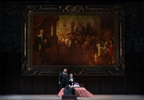 Anders sieht dies Rolando Villazón in seiner zweiten Regiearbeit an diesem Hause. Hier laufen Elvira und Arturo am Ende aufeinander zu, doch im letzten Moment drängelt sich Enrichetta dazwischen und Elvira bleibt im letzten starken Bild des Abends dann doch in ihrem Wahnsinn gefangen und scheint sich das ersehnte Happy End nur eingebildet zu haben. Hierbei gelingt Adela Zaharia über den gesamten Abend eine mehr als nur beeindruckende Leistung. Sie bringt die Zerrissenheit der Person mit starkem eindringlichem Schauspiel deutlich zur Geltung und glänzt mit strahlender Stimme und schönen Koloraturen. Besonders die große Wahnsinnsszene im 2. Akt ist ein musikalischer „Wahnsinn“ im übertragenen Sinne des Wortes. Ihr zur Seite steht der rumänische Tenor Ioan Hotea als Lord Arturo Talbot, der diese anspruchsvolle Rolle bis auf wenige Ausnahmen in den hohen Tönen absolut meistert. Zudem harmonieren beide Stimmen sehr schön und Rolando Villazón gibt den Figuren genug Raum zu glänzen. Auch die Rolle des Sir Giorgio bekommt sehr viel Gewicht, wird er doch immer wieder wie ein von der Macht getriebener Strippenzieher hinter den Kulissen dargestellt.