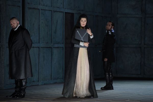Wie bereits erwähnt hält sich Rolando Villazón hinsichtlich der Personenführung hin und wieder etwas zurück, um die Sänger musikalisch voll glänzen zu lassen. Dies mag dem ein oder anderen vielleicht etwas antiquiert vorkommen, stört aber nicht im Geringsten. Zudem will er keinen Geschichtsunterricht bieten und ordnet die Geschichte zwar hinsichtlich der Kostüme (Susanne Hubrich) durchaus in einen historischen Zusammenhang, ersetzt die Säbel aber durch moderne Maschinengewehre. Auch dies stört nicht und ist auch mehr oder weniger der einzige wirklich aus der Zeit gerissene Aspekt der Inszenierung. Ein echter „Hingucker“ ist das große Bühnenbild von Dieter Richter, welches im ersten Akt aus einem großen Kirchenschiff mit einem detailreichen Chorgestühl besteht. Anders gedeutet kann der Raum auch gleichzeitig Palast und Gerichtssaal sein. Für die Szene in Elviras Schlafzimmer fährt eine Wand mit einem großen Bild herunter, um den Raum zu teilen. Dabei wird das Bild durch geschickten Lichteinsatz (Volker Weinhart) durchlässig und man sieht wie Elviras Vater mit Riccardo spricht. Im zweiten Akt wird das Chorgestühl durch graue Mauern ausgetauscht, um die innere Gefangenschaft von Elvira auch bildlich darzustellen. Vor dem dritten Akt bricht ein großer Teil aus der Rückwand heraus und wir befinden uns unterstützt von Herbstlaub und Staub vor den Gemäuern des Hauses. Später ist auch ein Wald zu erkennen, der das Gelände umgibt.