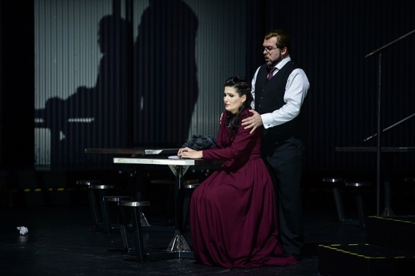 Der Niederländer ist nicht zum ersten Mal an der Rheinoper mit einer Umsetzung betraut und vermag es auch diesmal, durch Konzentration auf das Wesentliche und starke Symbolismen einen spannenden Opernabend zu präsentieren. Er verlegt das Geschehen in einen Gefängnistrakt des Hier und Heute, von der Empore eines Halbrunds, das Roel van Berckelaer gebaut hat, gehen Zellentüren ab, das Ensemble ist im zweiten Akt zusätzlich mit Besucherraum samt Snackautomat ausgestattet. Die heutiger Gesellschaftskleidung entsprechenden Kostüme von Eva Krämer werden seitens der Königinnen durch historisierende Gewandung ergänzt. Dieser Kontrast schafft schon optisch eine Konzentration auf die beiden Damen, die sich historisch verbürgt nie begegnet sind. Die eine trägt royales Blau, die andere gedecktes Bordeaux, das sich im Schlussbild zusammen mit dem durchdachten Licht von Stefan Bolliger, das auch während der kompletten Aufführung immer wieder für passende Atmosphäre sorgt, in knallendes Blutrot wandelt. Von Anfang an scheint bei Guy Joosten alles auf das unausweichliche Ende Marias zuzulaufen, die Liebesbeziehung zu Leicester wird zur Nebensache – im Zentrum dieses szenisch gelungenen Nachmittags stehen eindeutig die beiden Damen, die sich ein veritables Stimmduell liefern.