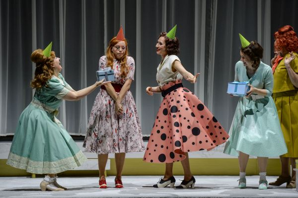 Die Kostüme von Ursula Kudrna sind bei der Poolparty deutlich den 50iger Jahren entsprungen, im Verlauf des weiteren Abends aber auch recht zeitlos gestaltet. Beim großen Maskenball in der dritten Szene gibt es hier zudem viel zu entdecken. Der durchaus aufwendige Bühnenraum stammt von