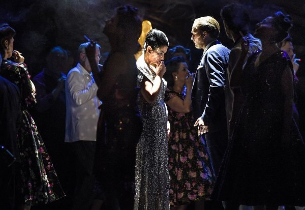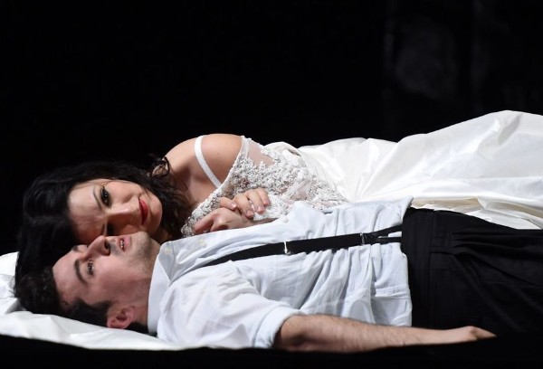 Bei der Rheinopern-Produktion von Gounods „Roméo et Juliette“ ist zunächst lobend auf das Protagonistenpaar einzugehen. Sowohl Luiza Fatyol als auch Ovidiu Purcel durchliefen zunächst das Opernstudio des Hauses und zählen jetzt zu den führenden Kräften des Ensembles. Luiza Fatyol ist eine hochversierte Kolorateuse (in dieser Spielzeit gibt sie u.a. noch Violetta), Ovidiu Purcel ein äußerst vielseitiger Tenor. Die vokale Gelenkigkeit der Sopranistin, ihre fulminanten Höhen beeindrucken ungemein. Ihr Timbre besitzt freilich eine leichte Schärfe, was mutmaßen läßt, daß sie irgendwann einmal Verdis Abigaille und vergleichbare Partien angehen könnte. Der Tenor hingegen überwältigt mit einer bis in extreme Spitzentöne hinein weich gerundeten, mühelosen Stimme, deren Strahlkraft einen mitunter förmlich umhaut. Piano-Finessen kommen dabei aber nicht zu kurz. An den individuellen Farbklang seines Organs muß man sich freilich etwas gewöhnen. Für beide Künstler gilt ohnehin, daß sie den im Prinzip lyrischen Charakter der dargestellten Personen nicht ideal treffen. Luiza Fatyols Julia wirkt weniger mädchenhaft jung als gesetzt mondän, was ihr Glitzerkleid unterstreicht; auch Ovidiu Purcels Romeo fehlt es ein wenig an adoleszenter Ausstrahlung.