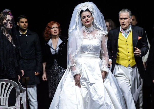 Diese Schlußszene schaut in Düsseldorf wie folgt aus. Capulet (Michael Kraus mit immer noch eindrucksvollen baritonalen Kraftreserven) findet seine Tochter mitnichten leblos vor, als er sie zur Hochzeit mit Graf Paris abholen will. Auch im Grabgewölbe ist Julia noch auf den Beinen, ihr zurückkehrender Geliebter weint sich lediglich an ihrem Hochzeitskleid aus, an welchem beide dann herumzerren. Während Romeo dann sein Leben aushaucht, wird Julia (kein Suizid per Gift oder Dolch) vom Vater dem vorgesehenen Gatten tatsächlich noch zugeführt und damit einem Adelsritual Genüge getan.