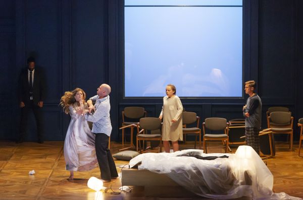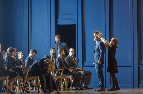Regisseurin Katie Mitchell verzichtet im Gegensatz zu Christof Loy in Berlin auf Lack- und-Leder-Comedy, sondern siedelt das Stück in einer eleganten Gegenwart an. Ausstatterin Vicki Mortimer hat einen schicken Raum entworfen, der aus einem Bett, einem Aquarium und einer Kunstvitrine entworfen, dessen Bestandteile schnell verschiebbar sind, so dass der Raum sich von Bild zu Bild verändert und auch den Niedergang des Königs optisch darstellt.