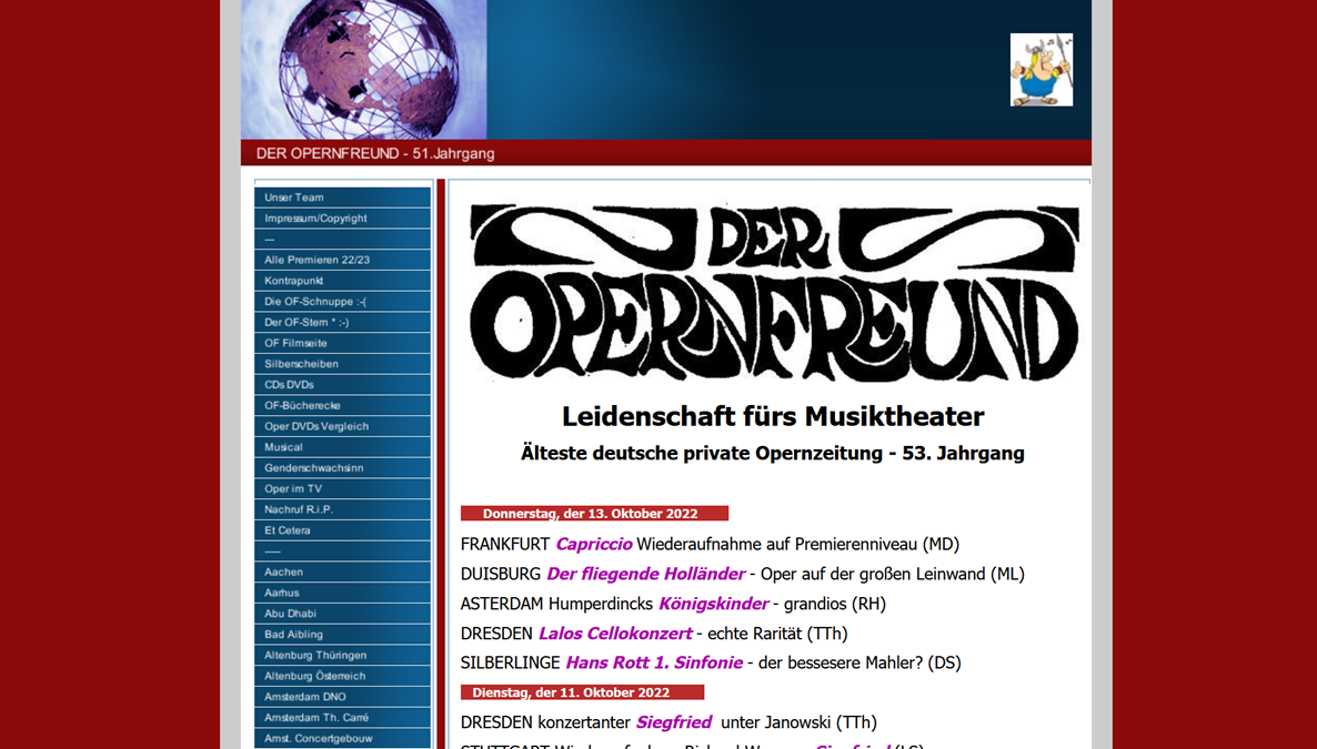 Wir haben ein Herz für das gesamte Musiktheater, also Oper, Operette, Musical und Tanz. Dabenen veröffentlichen wir auch Konzertkritiken sowie Besprechungen von Büchern und Tonträgern. Der OF gehört zu den meistgelesenen Klassik-Webseiten im deutschsprachigen Raum.
