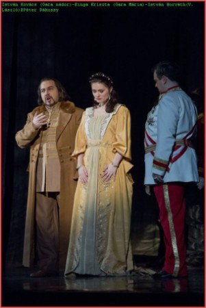 Regisseur Gábor Szűcs gelang es leider nicht die Handlung in nachvollziehbaren Bildern zu schildern und mit Spannung zu beleben. Ein mittels Videoprojektion eingeblendeter schwarzer Rabe, den auch der junge Mátyás in Papierform auf einem Stab hochhält und spielend herumschwingt, soll wohl als Symbol für das tragische Schicksal gelten. Die Idee ist aber nicht neu, denn schon Ruth Berghaus hat sie in ihrer Inszenierung von Schuberts Fierrabras im Theater an der Wien 1988 wenig schlüssig verwendet. Zu Beginn wird uns das Gefolge der Hunyadis als moderne Geschäftsleute in dunklen Anzügen vorgeführt. Später wechselt die Ausstattung aber in die Zeit der Entstehung der Oper in den 1840er Jahren. Zu jener Zeit wurde das habsburgische Reich von dem wenig erfolgreichen Ferdinand I. (1793-1875) regiert, der als Ferdinand V. ab 1830 auch König von Ungarn und Kroatien war. Ungeachtet dieses historischen Kontextes trägt König Ladislaus V. in dieser Inszenierung jedoch mehr die Züge von Kaiser Franz Joseph, einem zwar gleichfalls verhassten, jedoch im Vergleich zu Ferdinand V. weniger unbeholfenen Herrscher. Die Idee des Regisseurs, die Hosenrolle des jungen Mátyás aufzuteilen, empfand ich als nicht besonders geglückt. Während dieser nun von einem Knaben stumm dargestellt wird singt ein Mezzo seinen Part als „nicht agierender“ Begleiter. Als störend empfand ich auch die Tanzeinlagen (Choreographie: Csanád Gergely Kováts), die wie aufgesetzt wirkten und auch die Bewegungsregie des Chores gefiel sich in eher beiläufigen Stereotypen. Die Burgen von Nándorfehérvár, Buda und Temesvár waren in dieser Inszenierung äußerlich kaum zu unterscheiden. Bei den Kostümen von Enikő Kárpáti war das 19. Jhd. vorherrschend, die Ungarn in prächtiger Nationaltracht, die österreichischen Soldaten in Uniform. László Hunyadi wiederum wirkte in seinem Ledermantel, den er während der ersten beiden Akte trug, mehr wie ein Rocker als ein ungarischer Edelmann. Und auch Cilleis Uniform beschwor düstere Zeiten deutscher Wehrmacht herauf als jene der damaligen kaiserlichen Armee.