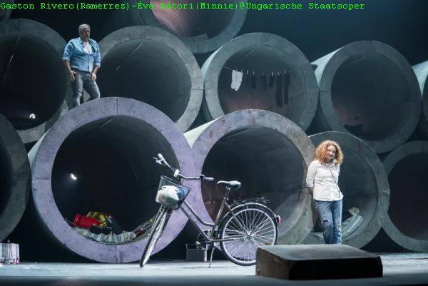 Die drei Hauptfiguren der Oper, Minnie, Ramerrez und der Sheriff, waren an diesem Abend exquisit besetzt. Éva Bátori als Minnie gestaltete diese Figur als mütterlichen Typ, der für die Probleme der Arbeiter stets ein offenes Ohr hat und darüber ihr eigenes Schicksal in den Hintergrund drängt. Mit ihrem kräftigen Sopran trat sie gleich zu Beginn bühnenbeherrschend auf. Ihr zur Seite standen an diesem Abend zwei ebenso starke Sängerdarsteller: Der aus Uruguay stammende Tenor Gaston Rivero gab einen starken Banditen Dick Johnson, der aus Liebe zu Minnie darauf verzichtet, diese zu bestehlen. Um deren Liebe buhlt aber auch der Polizist Jack Rance, gesungen von einem der führenden Baritone der Ungarischen Staatsoper, Csaba Szegedi, den Minnie im Pokerspiel um den Banditen Ramerrez durch eine Mogelei geschickt besiegt. Puccini war sich des Problems bewusst, dass er nicht für die übrigen kleineren Rollen jeweils Arien schreiben konnte.