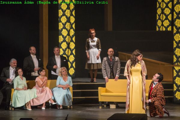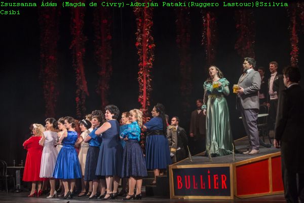 Regisseur Ferenc Anger versuchte gemeinsam mit seinem Ausstatter Gergely Z. Zöldy den die Mode von Monte Carlo zur Zeit der Uraufführung festzuhalten. Zsuzsanna Ádám gab eine stimmgewaltige Lebedame Magda de Civry mit strahlendem Sopran, stabil auch bei den gefürchteten Höhen ihrer Partie. Adorján Pataki war ihr verarmter Liebhaber Ruggero Lastouc mit gut geführtem Tenor. Sándor Balla in der Rolle des reichen Bankiers und Liebhabers von Magda, Rambaldo Fernandez, verspricht sich Magdas Liebe durch Überreichung einer teuren Perlenkette erkaufen zu können. Diese aber glaubt die wahre Liebe, in dem Studenten Ruggero erblickt zu haben. Katalin Kolcsár war eine eher schrill singende Lisette, Dienerin von Magda, die von einer Gesangskarriere träumt. Bardon Tony als Dichter Prunier will Magda die Zukunft aus ihrer Hand lesen. Seine Vorhersage ist jedoch zweideutig. Sie könne ein schönes Leben wie eine Schwalbe in der Sonne finden, allerdings wäre es mit Tragik verbunden. Das Trio Pataki Enikő, Zseike Székely und Judit Hary als Magdas Freundinnen Yvette, Suzy und Bianca sorgten Limonade schlürfend für köstliche Situationskomik.
