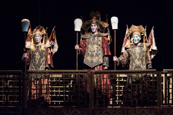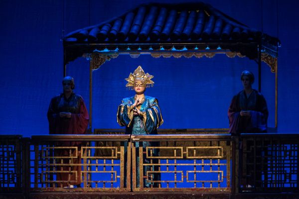 Nun ist die äußerst farbenprächtige und choreographische Inszenierung der Turandot von Balázs Kovalik aus dem Jahr 1997 wieder in das Erkel Theater, dem Ort seiner Premiere, zurückgekehrt. Und der Chor kann nun wieder, wie in der Regie vorgesehen im zweiten Akt effektreich vom Zugang zu den Balkonlogen aus, im zweiten Akt auftreten. Das Regiekonzept folgt im Wesentlichen dem von Carlo Gozzi vorgegebenen Märchenduktus und versucht nicht zu aktualisieren oder zu modernisieren. Das Bühnenbild von Éva Szendrényi wird von zwei symmetrischen, abgewinkelten Stiegen Aufgängen beherrscht, über die Lanzen- und Schwertträger hinauf- und hinablaufen.