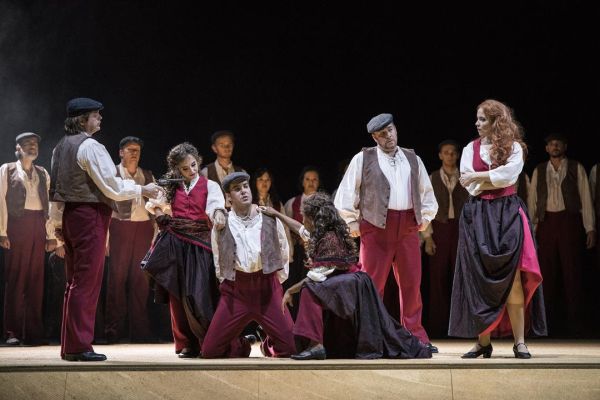 Unter Sébastien Rouland (ab dieser Spielzeit GMD in Saarbrücken) spielen die Essener Philharmoniker das „Carmen“-Vorspiel mit Rasanz, Messerschärfe und enormem Klangfeuer. Kritisch sind freilich immer wieder die Tempi des Dirigenten. Das Lodernde des Beginns ist sicher nicht überall so brioscharf durchführbar. Aber die Gangart des Musizierens wirkt (ungeachtet einiger gezielter Verlangsamungen und Ritardandi) immer wieder leicht gebremst. Nicht, daß geschleppt würde, doch empfindet man einen gewissen Mangel an konsequentem Drive. Das Schmuggler-Quintett lief in der Premiere nicht von ungefähr aus dem Ruder. Doch wie auch immer: das Orchester ist Spitze.