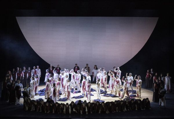 Die ganze visuelle Aussagelosigkeit korrespondiert mit der eigentlichen Inszenierung. Nicht sämtliche wunderlichen Details sollen beschrieben werden. Nur so viel … Es scheint, als ziele die Regie auf Teufel komm raus darauf ab, eine realistische, dramatisch pulsierende Darstellung der Opernhandlung zu unterlaufen. Die Inszenierung wirkt wie ein Schachspiel, auf welchem die Figuren nach intellektuellem Gusto hin- und hergeschoben werden. Der Chor nimmt meistens eine Habt-Acht-Stellung ein oder umstellt kreisrund die Bühne, fuchtelt dabei zeitweilig wild mit den Armen. Vieles passiert auch plakativ an der Rampe.