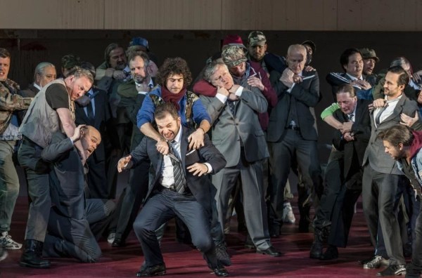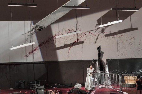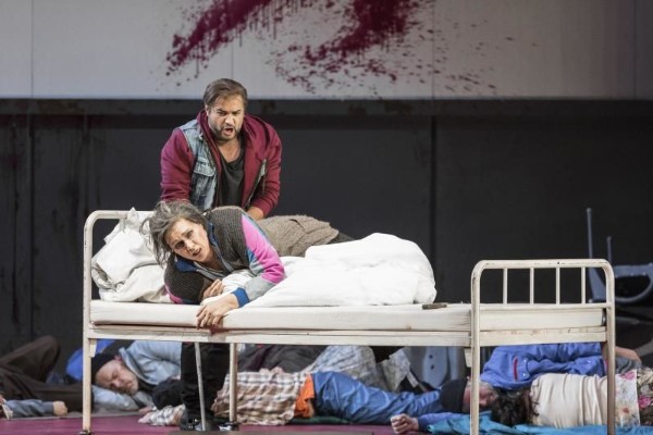 In dem tristen Bühnenbild von Christian Fenouillat, das mit an den Wänden aufgestellten Plastikstühlen und einem Rollgitter an der rechten Seite die Tristesse einer Lagerhalle verströmt, müssen die bemitleidenswerten Sängerinnen und Sänger sich einer Kriegsszenerie unterwerfen, die nichts zur Erhellung des komplizierten Sujets beiträgt, sondern dem Ganzen aufgepfropft wird und immer wieder zu absurden und auch abstoßenden Einfällen führt. Graf Luna erschießt eigenhändig seinen Bruder Manrico und die Zigeunerin Azucena mit einer Pistole, die Stretta Manricos wird am Ende durch einen Bombentreffer „zerschmettert“, der nicht nur Gaston Rivero, dem Sänger des Manrico, seinen Spitzenton verhagelt, sondern auch den Bühnenraum in eine Trümmerwüste verwandelt, Azucena singt ihre berühmte Auftrittsarie in einem weißen Krankengitterbett, Manrico eilt mit einer Krücke zum Stelldichein mit Luna und benutzt seine Gehhilfe dann als Waffe im Kampf um die Geliebte und dergleichen wunderbare Einfälle mehr.
