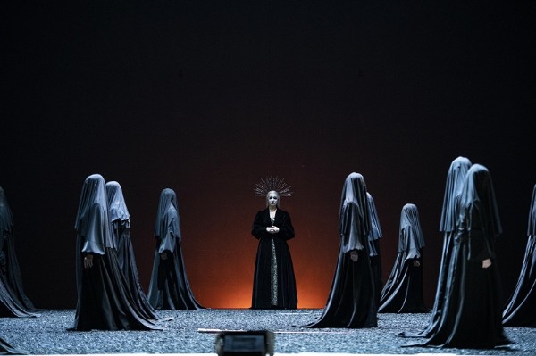 Beflügelt durch die grandiose Ausleuchtung der fast requisitenlosen Szenerie, die überdimensionale, ja übermächtige Schatten erzeugt, malt Ben Baur fast statisch wirkende Bilder, die Didos Inneres spiegeln. Uta Meenen krönt Dido und ihr Alter Ego, die Zauberin, mit einem madonnenhaften Lichterkranz, steckt Bedienstete und Chor in schlichte schwarze Schleier; Kriegsheld Aeneas kommt gar nicht heldenhaft daher, sondern ist blutverschmiert und sichtlich des Kämpfens müde. So erklärt sich auch, warum er sich Didos Wunsch, sie zu verlassen, nicht widersetzt, sondern resigniert die Segel streicht. Die symbolismengetränkte, düstere Bebilderung allein aber könnte den kurzen Abend nicht tragen ohne die exquisite musikalische Interpretation.