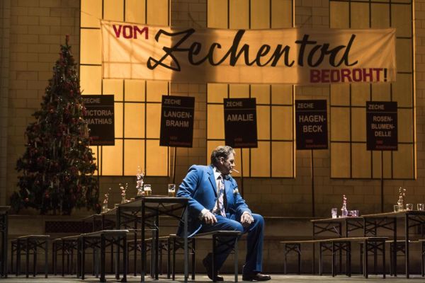 Die Erdgeister (irgendwann als „Kapitalisten“ apostrophiert) werden zu Kumpeln im Kohlebergwerk. Während der Ouvertüre läuft ein Film über sie und ihr Milieu ab – penetrant. Und da die die letztendliche Chefin der Unterwelt, die Königin der Erdgeister, in Gestalt von Rebecca Teem (gleißender Sopran mit etwas viel Vibrato) wie eine etwas tumbe Mutterglucke wirkt, driftet dieser Lebensbereich zusätzlich ins Ungefähre, Vage. Die Titelfigur porträtiert der großartige Heiko Trinsinger (vor zwei Jahren trat er an der Komischen Oper Berlin auch im „Vampyr“ auf), wirkt attraktiv in seiner maskulinen Eleganz und baritonalen Noblesse, welche sich in der bekannten Arie „An jenem Tag“ sogleich bestechend manifestiert. Aber einen wirklich triftigen Charakter vermag auch er nicht herbeizuzaubern. Allerdings ist ihm ein spektakuläres Finale gegönnt: er sprengt am Schluss sein Imperium in die Luft (Zeche Zollverein?), probates Bild für eine persönlich Tragödie.