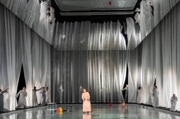 In „Suor Angelica“, im direkten Anschluss an den „tabarro“ gespielt befinden wir uns vom Stück ausgehend in einer fast schon pittoresk anmutenden Klosterszenerie. Aus Düsternis wird ein luftiger, lichtgefluteter Raum. Die Schwestern machen das, was man eben so erwartet, sie sammeln Almosen, ernten Kräuter, sie beten und büßen. In Essen bleibt die Wasserfläche erhalten und wehende Vorhänge verleihen der Szenerie das mystische, ja religiöse. In der Titelpartie glänzt Jessica Muirhead mit einem herzergreifenden Rollenportrait, fein nuanciert und mit bestem Puccini-Sound in der Stimme. Die Regie von Roland Schwab nutzt hier den klösterlichen Kontext aber nur als Projektionsfläche – der vermeintlich so leicht zu verlassende Raum ist ein doch schreckliches inneres Gefängnis Angelicas, die in der Sorge um ihr ihr weggenommenes Kind fast umkommt. Der Raum öffnet sich erst, als sie sich von ihrem irdischen Dasein verabschiedet. Regisseur Roland Schwab zeigt hier eine zutiefst schlüssige und plausible Deutung des Stücks, das ohne jeglichen Kitsch auskommt und sich nicht in der pittoresken Klosterszenerie verliert. Gabriele Rupprecht, liefert gerade hier wunderbare Kostüme, die fernab klassischen Nonnenhabits sind, aber doch die Strenge klösterlichen Lebens und die Uniformität der Mitschwestern suggeriert. Einzig Angelica kommt farblich nicht in der Welt ihrer Mitschwestern an und bleibt in zartem, pastelligen rosa.