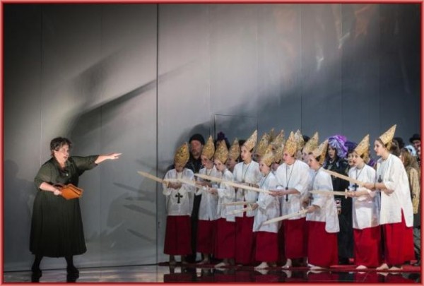 Berthe greift sich dann beide, hüllt sich gewissermaßen in sie ein und singt dazu ihre Arie. Ein Bild von wahrhaft bestechender Aussagekraft. Noch archetypischer ist die Idee, der hausmütterlich gekleideten Fidès (für die Kostüme ist ebenfalls Herr Boussard verantwortlich) ein Handtäschchen aufzuzwingen, welche sie von Anfang zu tragen hat und auch bei ihrer Szene „O prêtres de Baal“ nicht ablegt. Für die Sängerin eine inszenatorische Zumutung.