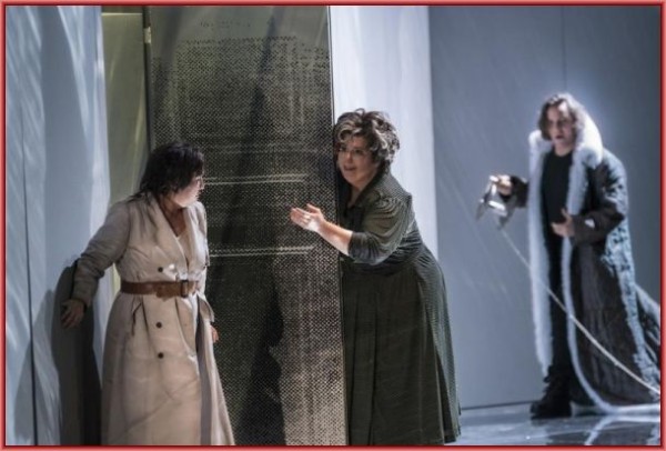 Die Misere des Abends beginnt bereits mit dem Bühnenbild. VINCENT LEMAIRE begrenzt die Szene mit zwei quer gestellten Wänden. Auf der sehr aktiven Drehbühne ist ein Wandrondell mit drei Raumsegmenten installiert. Das sorgt zwar für flüssige Bildwechsel, aber der ganze Aufbau wirkt aseptisch, die gräulich neutrale Farbe nichtssagend. Der gespiegelte Boden wirft freilich Lichtmuster auf sie, was schon mal ganz nett ausschauen kann, aber keine interpretatorischen Signale bietet. Im 4. Akt regnet es tüchtig (Projektion). Die in Armut geratene Fidès wird also, bewegungslos auf einem Stuhl sitzend, mit aufgespanntem Regenschirm hereingefahren und trifft später auf Berthe, ebenfalls mit einem Regenschirm bewaffnet.