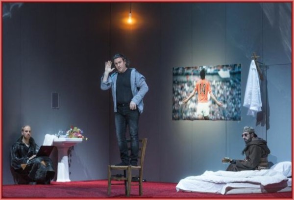 Die Protagonisten. LYNETTE TAPIA becirct mit innigen Spitzentönen und melodischer Sanftheit; für die Rolle der immerhin mit einiger Leidenschaft agierenden Bethe wirkt ihre Stimme freilich etwas zu Blondchen-haft. Voll und ganz wirft sich MARIANNE CORNETTI auf die über zwei Oktaven umfassende Partie der Fidès. Es beeindrucken ungeachtet minimaler Grenzwirkungen Inbrunst des Ausdrucks, geschmeidige Kantilenenformung und dramatische Attacke. Auf den Sängerthron möchte man freilich JOHN OSBORN als Jean de Leyde heben. Der 44jährige Amerikaner verfügt über einen schön timbrierten, kraftvollen Tenor, welcher sich selbst in extremer Höhe mit raffinierten dynamischen Abstufungen zu artikulieren vermag. Übrigens hängt in Jeans lediglich von einer nackten Glühbirne erhelltem Zimmer das Poster irgendeines Fußballstars, er selber greift immer wieder zu einer Rockgitarre – diese genialen Bildeinfälle seien zum Schluss doch noch erwähnt. Osborns (auch von der äußerlich Erscheinung her stimmige) Rollenpersönlichkeit ficht das kaum an. Nicht zuletzt wegen ihm hält man die viereinhalbstündige Aufführung zwar mit Ingrimm, aber tapfer durch.