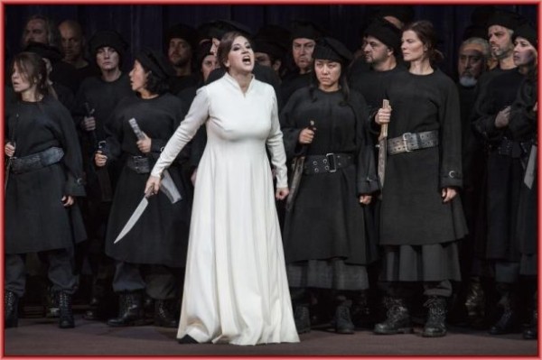Bisher war es gelungen, ihre gallischen Landsleute ruhig zu stellen. Jetzt regt sich der Widerstand gegen die römischen Besatzer. Die Geduld ist am Ende. Norma hat ein vitales Interesse, den Konflikt zu dämpfen: Die zur Keuschheit verpflichtete Priesterin pflegt seit Jahren eine verborgene Beziehung, noch dazu zu einem Römer, dem kommandierenden Prokonsul der Besatzungstruppen. Noch einmal will sie die Lage unter Kontrolle halten: „Sediziose voci“, ihr Auftritt in Bellinis wohl berühmtester Oper, weist die aufrührerischen, kriegerischen Stimmen in die Schranken. Doch in der neuen „Norma“ am Aalto-Theater Essen, der ersten von nur fünf Neuinszenierungen der Saison, wendet sich Katia Pellegrino, ganz in Weiß, ans Publikum. So als ob der Unmut aus dem Essener Publikum und nicht aus den Reihen der brav angetretenen, ordentlich gereihten Gallier käme.